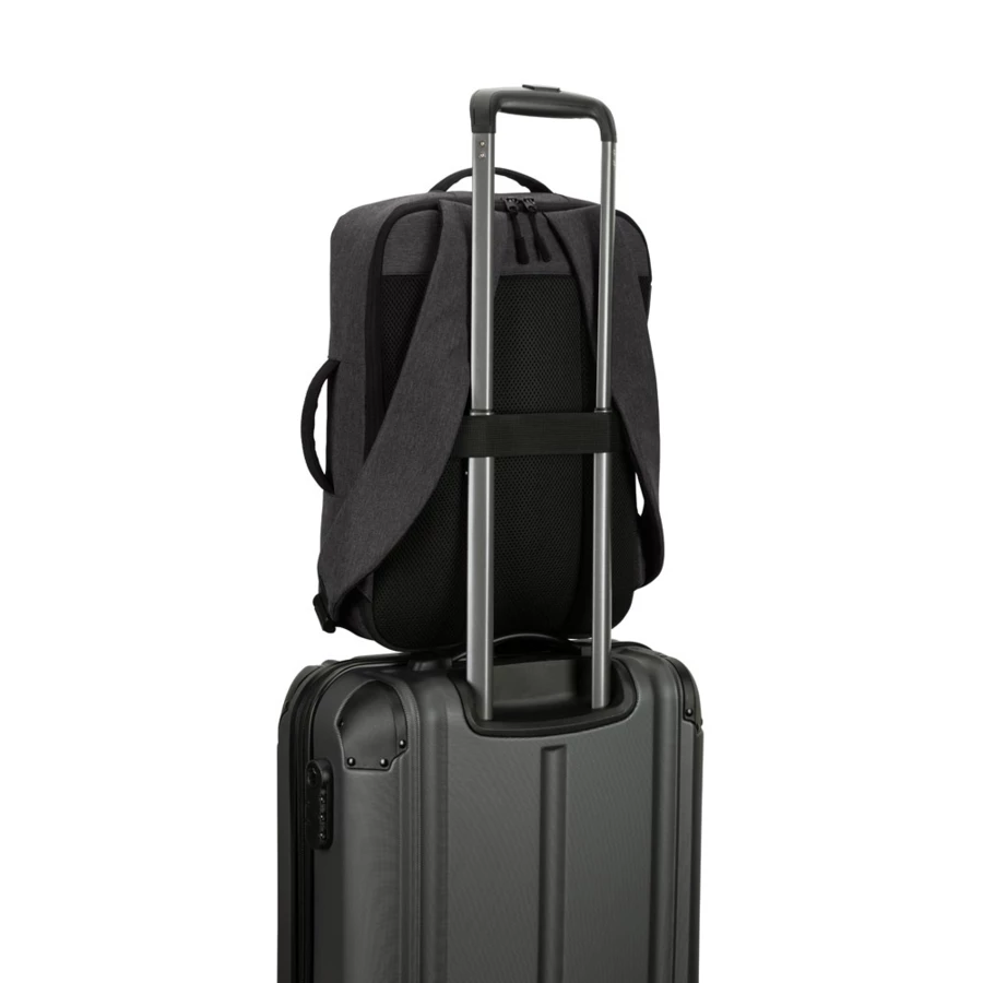 Plecak na laptopa wykonany z trwałego poliestru 300D z recyklingu i podszewki z poliestru 190T z recyklingu. Główna komora pomieści laptopa do 15.6" i może być całkowicie otwierana, co ułatwia dostęp do wnętrza. Z przodu znajduje się przestronna kieszeń. Dzięki bocznemu uchwytowi i kompaktowej formie, plecak może pełnić również funkcję torby na laptopa. Tylna część z siateczki wyposażona jest w pasek do zamocowania na walizce. Pojemność do 15 l. 300 x 410 x 110 mm