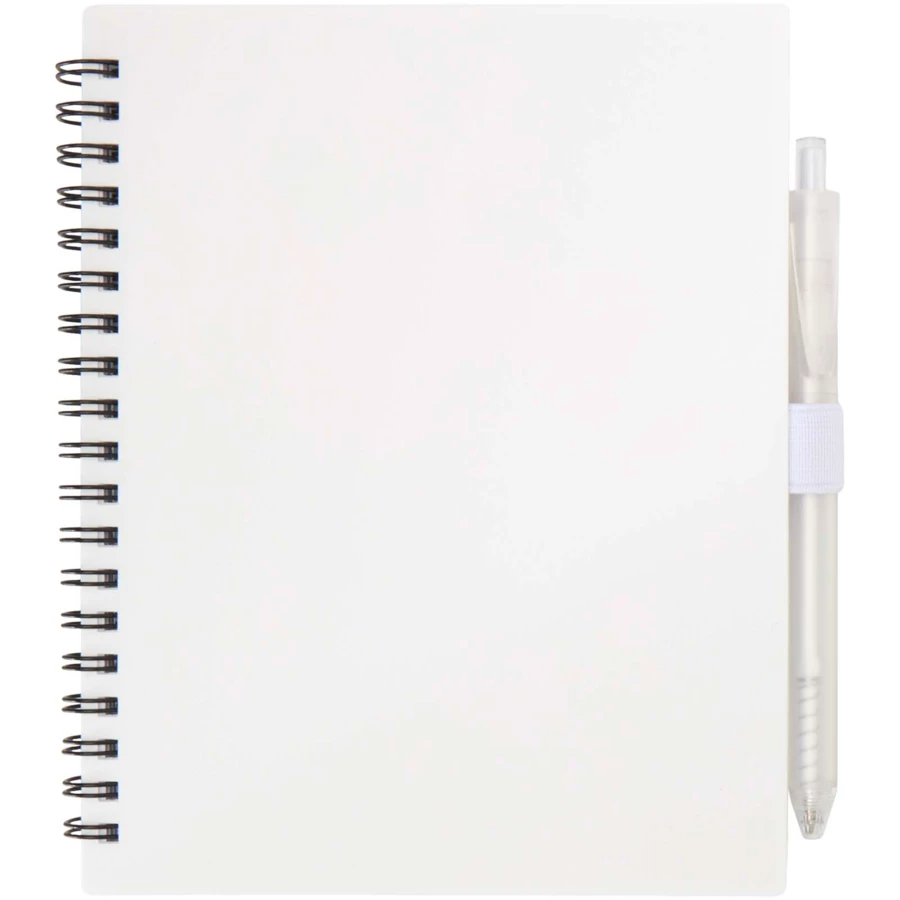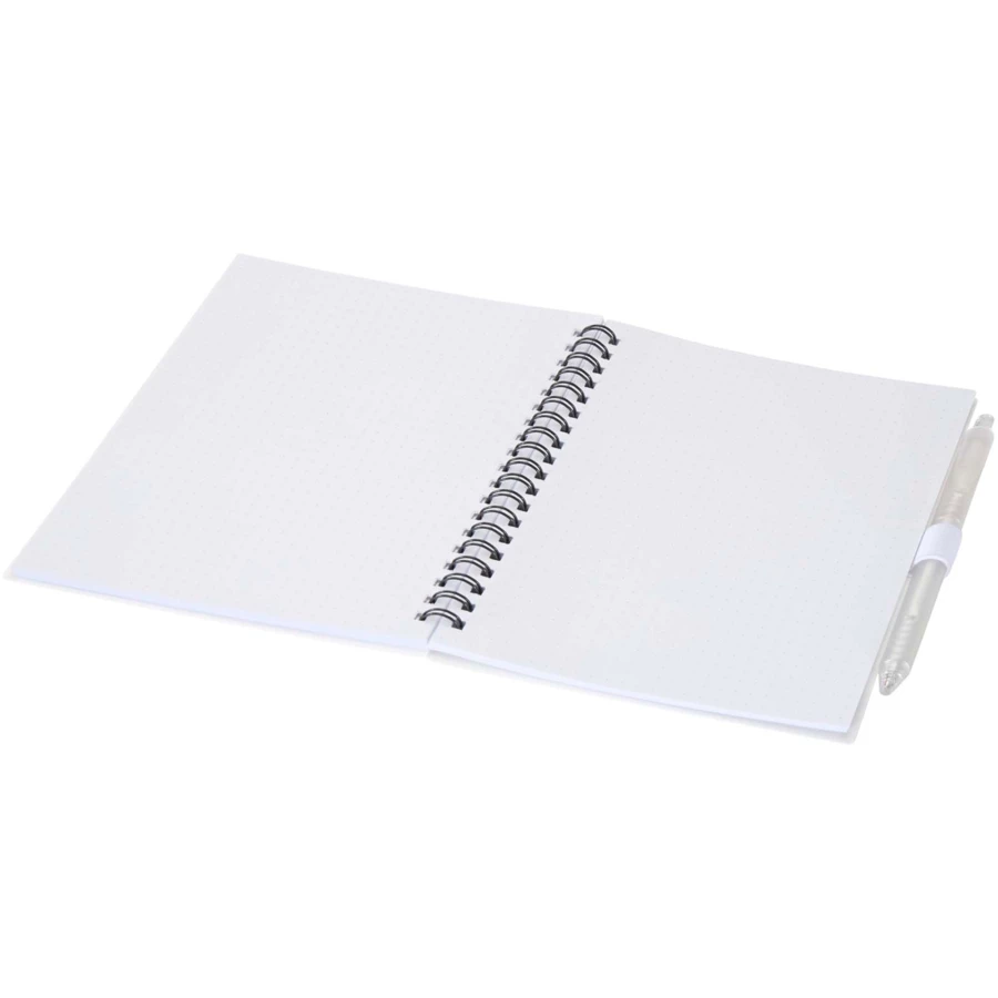 Notatnik z miękką okładką Niove wykonany z tworzyw sztucznych pochodzących z recyklingu i zawierający 70 kartek w kropki o gramaturze 70 g/m². Notatnik ma ostre rogi i wsuwkę na długopis. Rozmiar notatnika: 140 x 178 mm. Długopis również jest wykonany z plastiku pochodzącego z recyklingu. Kolor tuszu: Niebieski. Wydajność: 800 metrów. Grubość linii: 1,0 mm.