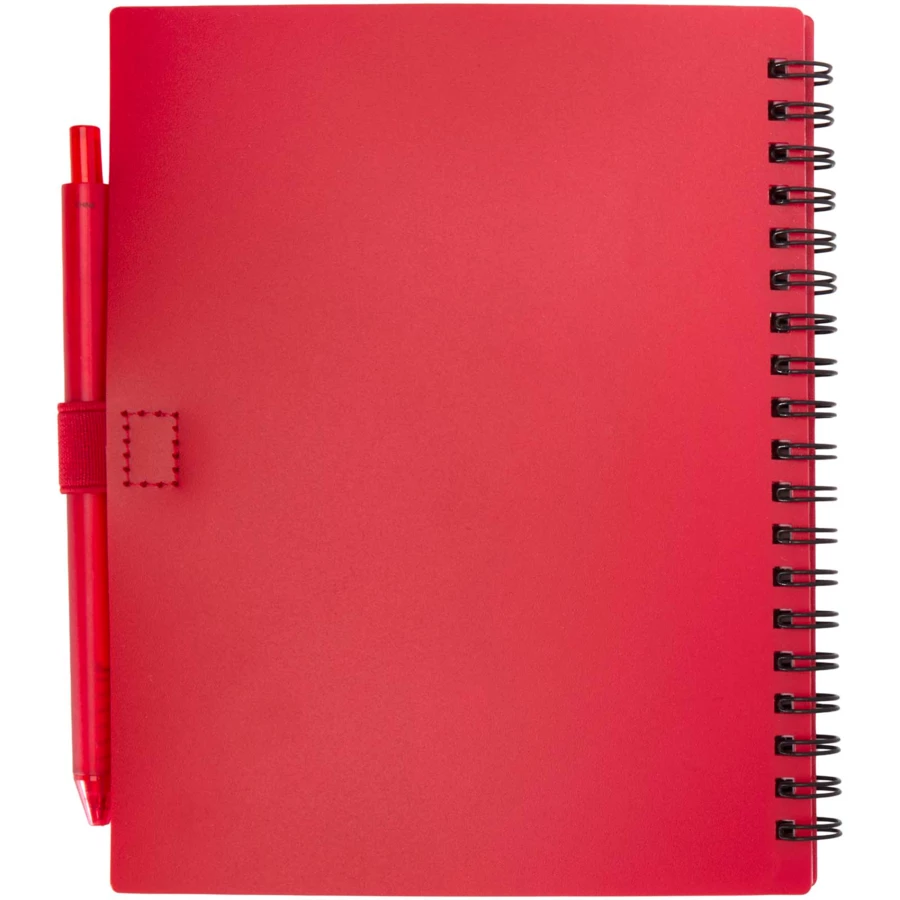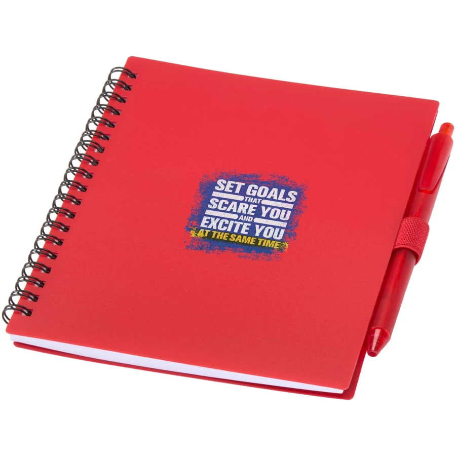 Notatnik z miękką okładką Niove wykonany z tworzyw sztucznych pochodzących z recyklingu i zawierający 70 kartek w kropki o gramaturze 70 g/m². Notatnik ma ostre rogi i wsuwkę na długopis. Rozmiar notatnika: 140 x 178 mm. Długopis również jest wykonany z plastiku pochodzącego z recyklingu. Kolor tuszu: Niebieski. Wydajność: 800 metrów. Grubość linii: 1,0 mm.
