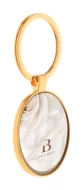 Okrągły metalowy brelok do kluczy w złotym wykończeniu z brązową płytką. W pudełku z papieru kraft.