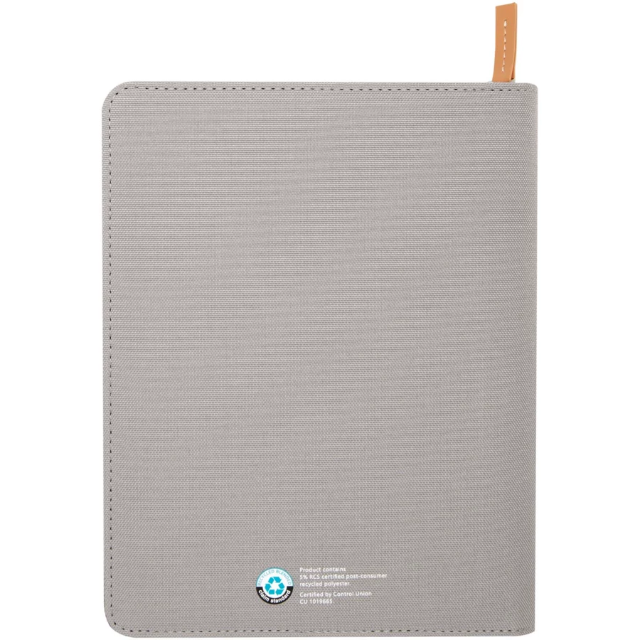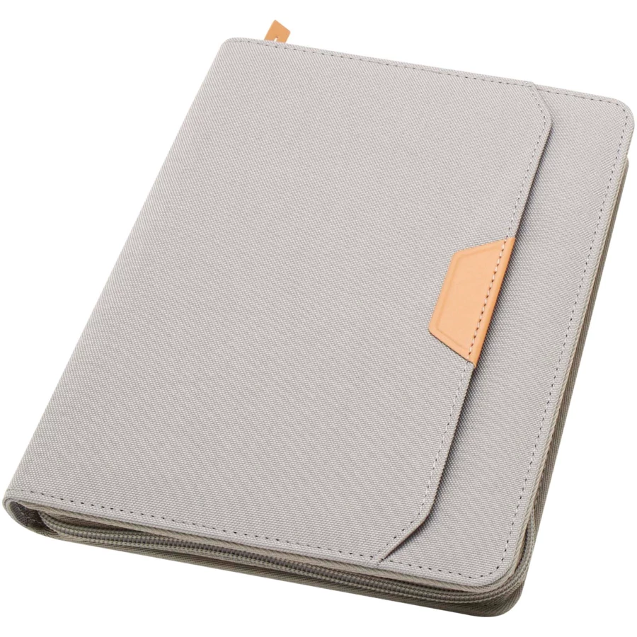 Teczka z notatnikiem do pisania Nomumi w formacie A5 o zaokrąglonych rogach to poręczny i niezbędny w biurze gadżet, wykonany z plastiku pochodzącego z recyklingu. Zawiera 64 kremowe kartki w linie z papieru o gramaturze 80 g/m22 i jest wyposażona w zapięcie na suwak, szlufkę na długopis i kieszeń harmonijkową.
