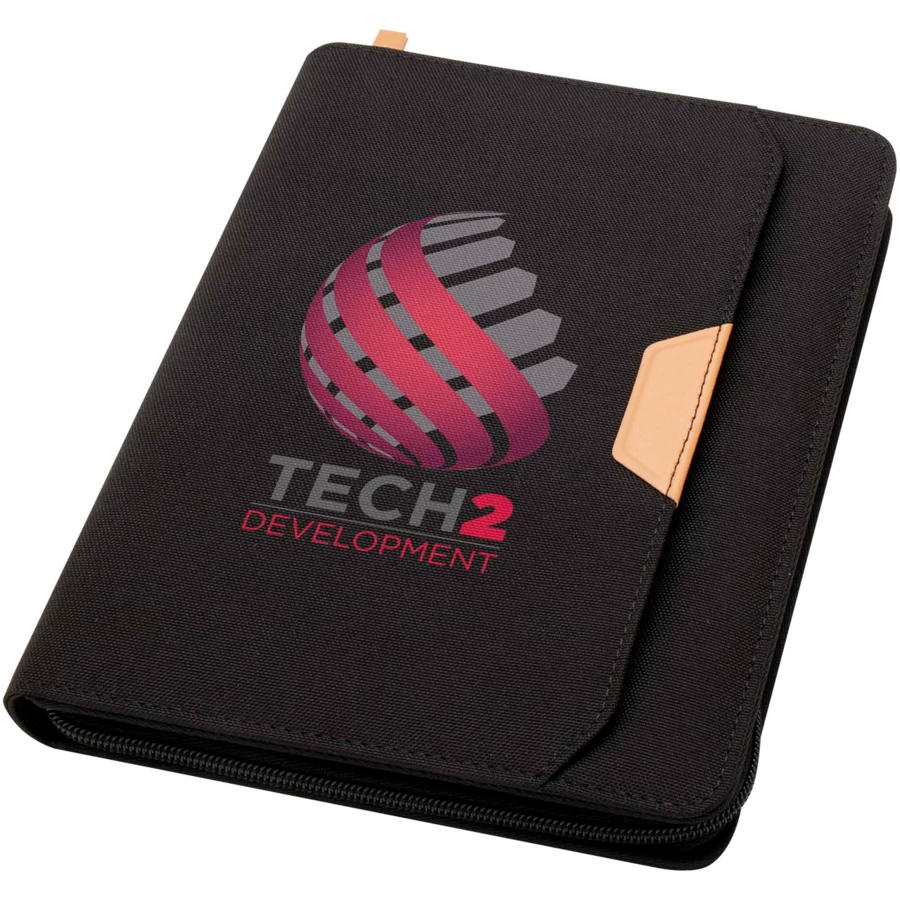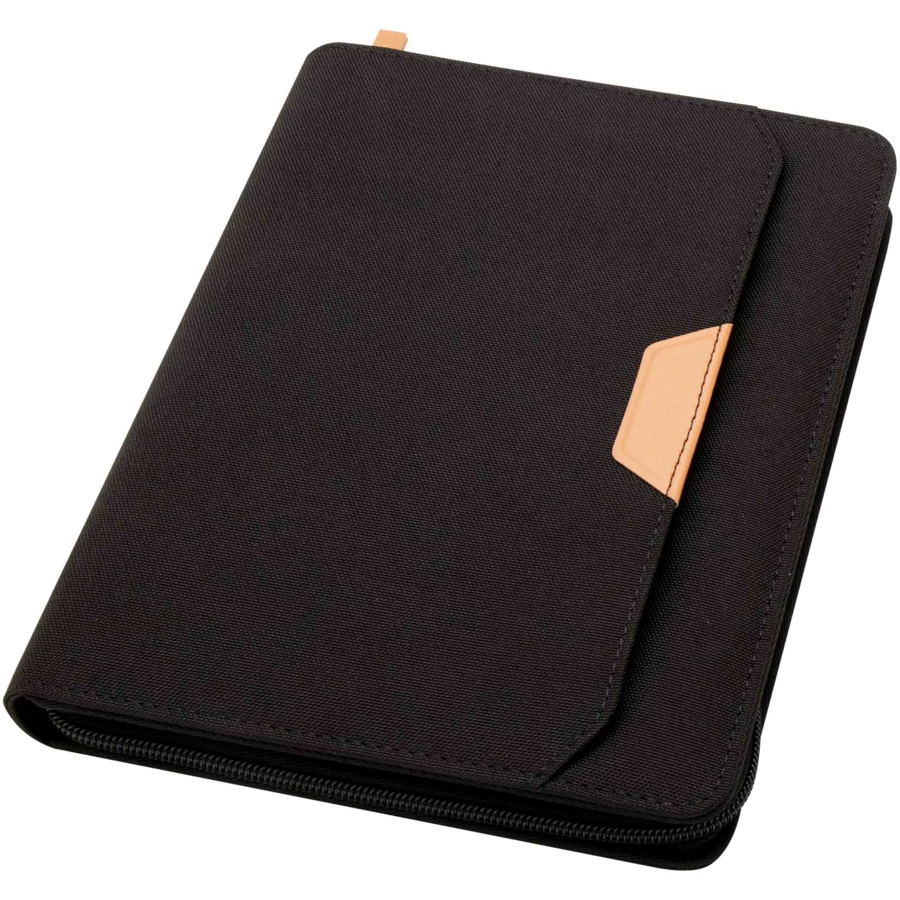 Teczka z notatnikiem do pisania Nomumi w formacie A5 o zaokrąglonych rogach to poręczny i niezbędny w biurze gadżet, wykonany z plastiku pochodzącego z recyklingu. Zawiera 64 kremowe kartki w linie z papieru o gramaturze 80 g/m22 i jest wyposażona w zapięcie na suwak, szlufkę na długopis i kieszeń harmonijkową.