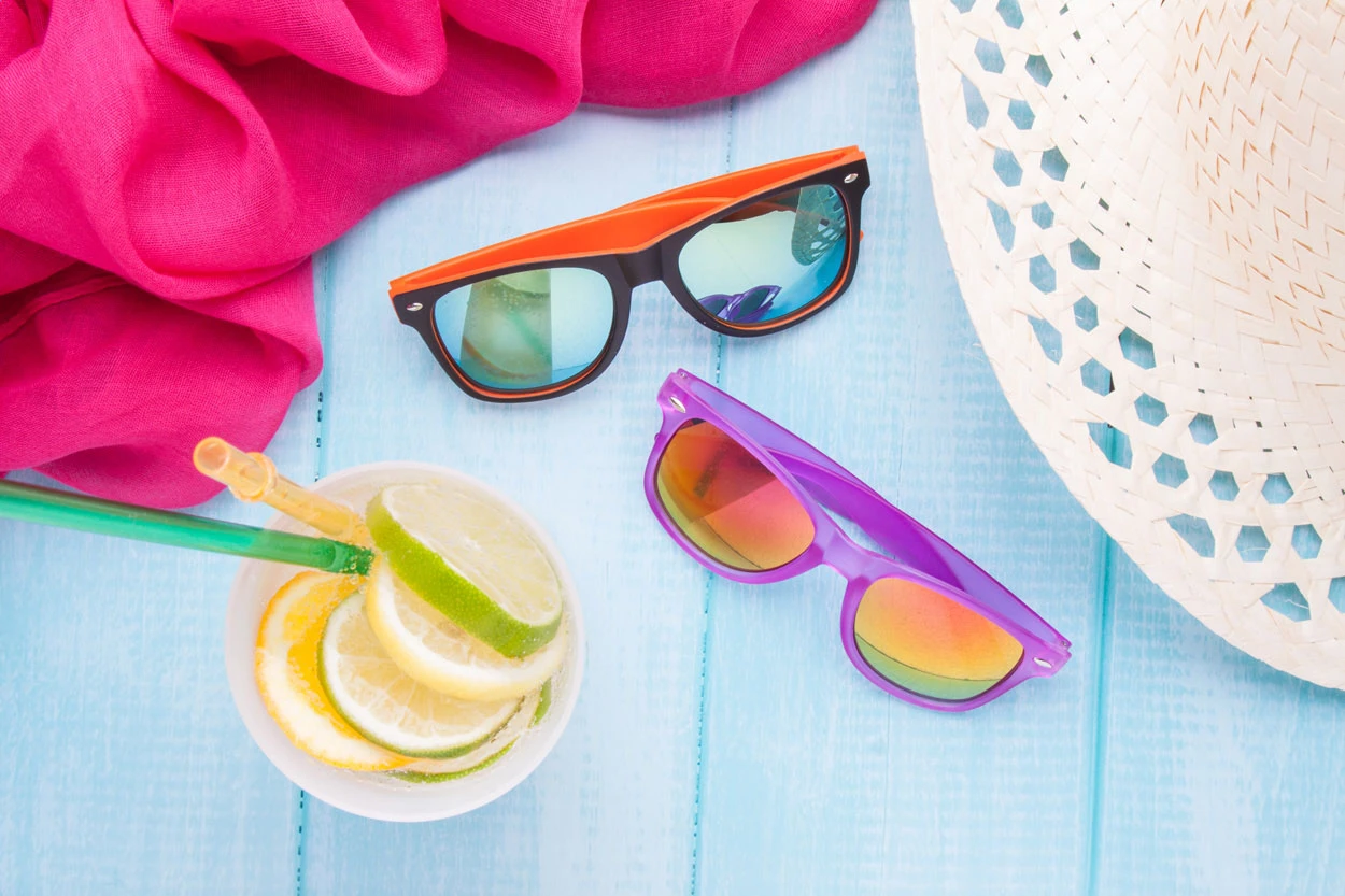 Plastikowe okulary przeciwsłoneczne z dwukolorową oprawką, lustrzanymi soczewkami i ochroną UV 400.