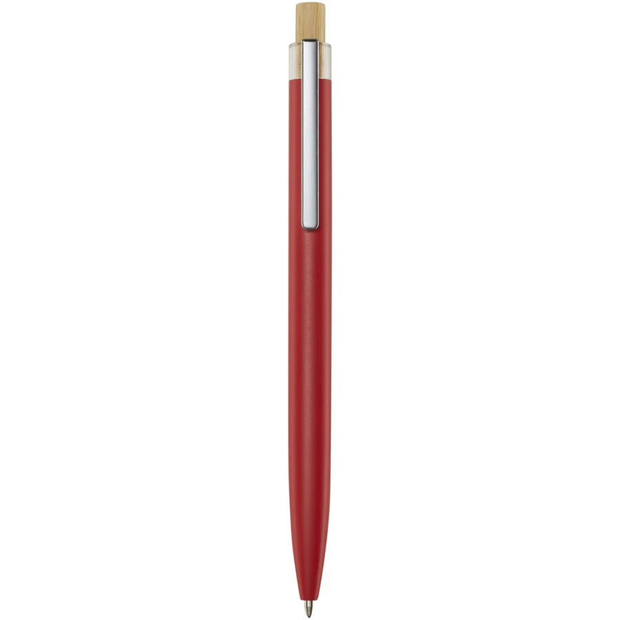 Nooshin długopis wykonany z aluminium pochodzącego z recyklingu, którego produkcja wymaga mniej energii niż w przypadku aluminium wyprodukowanego z surowców. Ogranicza również ilość odpadów na wysypiskach śmieci i pomaga chronić zasoby naturalne w celu zmniejszenia emisji gazów cieplarnianych. Przycisk jest wykonany z bambusa. Kolor tuszu: Niebieski. Żywotność: 800 metrów. Rozmiar stalówki: 1,00 mm.