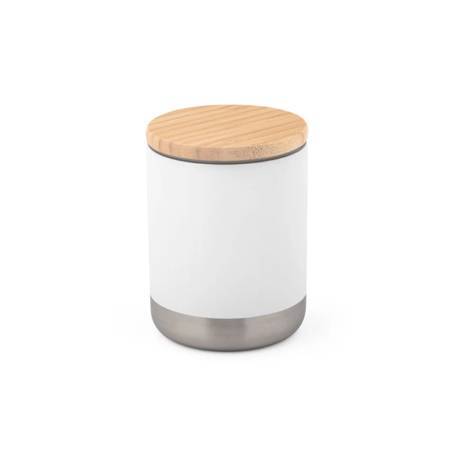 Kubek wykonany ze stali nierdzewnej (36% z recyklingu) o podwójnych ściankach z bambusową pokrywką i silikonową uszczelką dla dodatkowej ochrony. Kubek ma pojemność do 370 mL. Posiada również powłokę proszkową, która zapewnia jej większą trwałość i wytrzymałość. Dostarczany w pudełku upominkowym z papieru kraft. Ponieważ produkt jest wykonany z naturalnych materiałów, kolor produktu oraz wynik drukowania mogą się różnić w zależności od produktu. ø80 x 106 mm