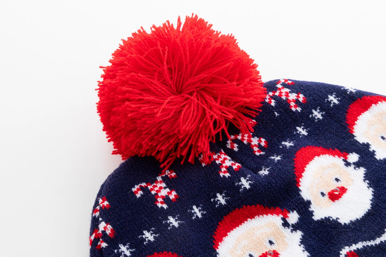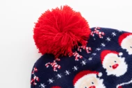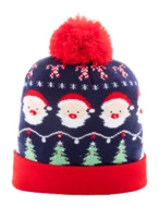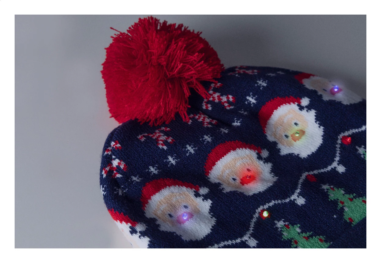 Dzianinowa czapka świąteczna z akrylu z 6 diodami LED (3 tryby świecenia), mankietem i pomponem. Zasilana baterią guzikową.