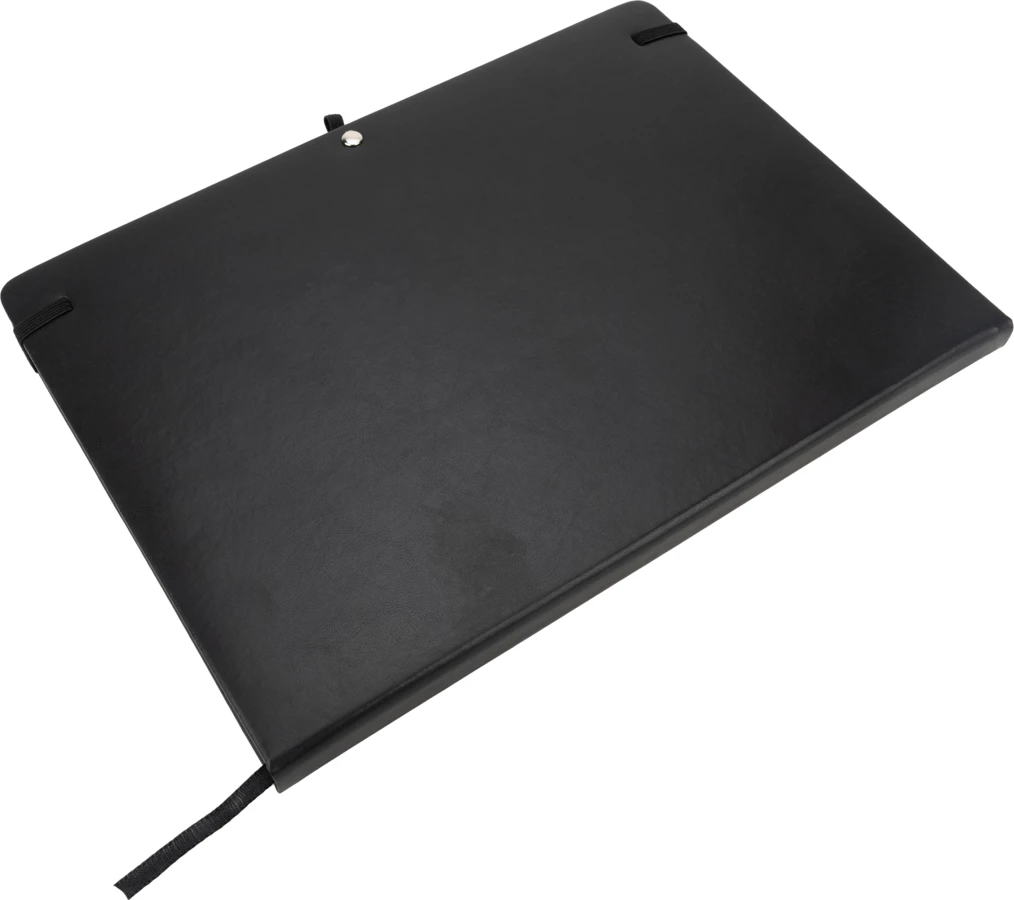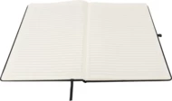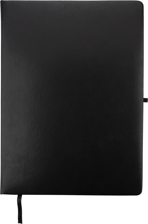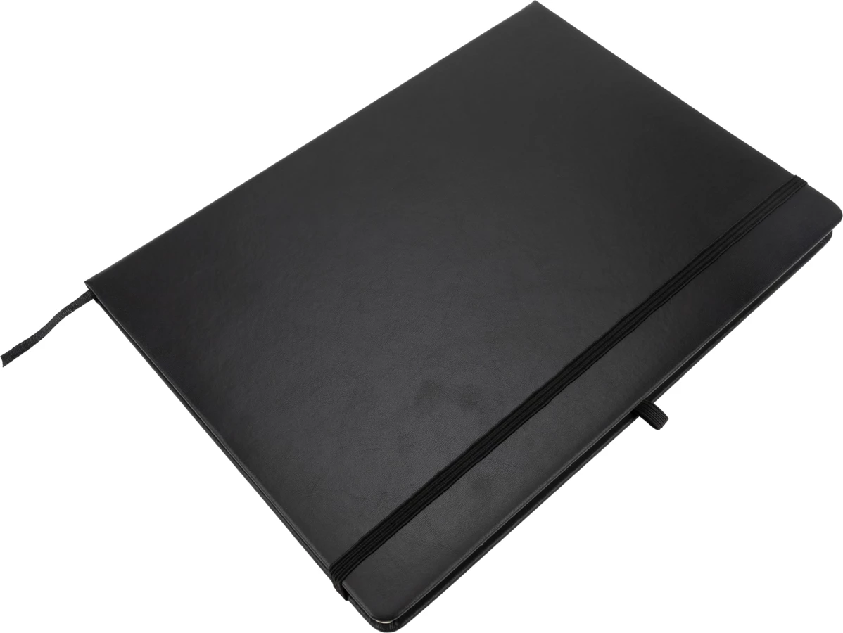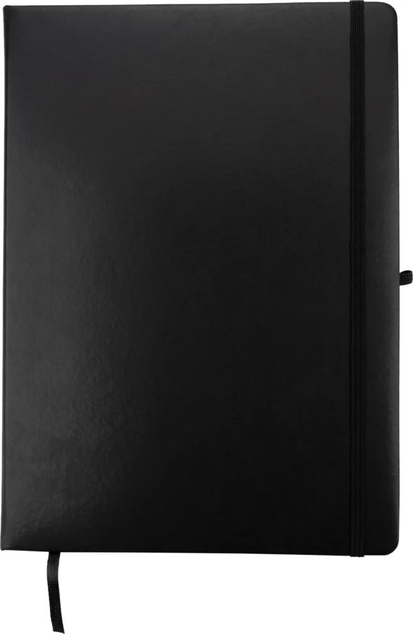 Notes A4 w linie (80 kartek) z okładką z tworzywa sztucznego, zakładką i miejscem na długopis. Zamykany na gumkę.