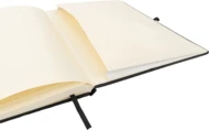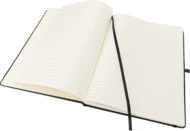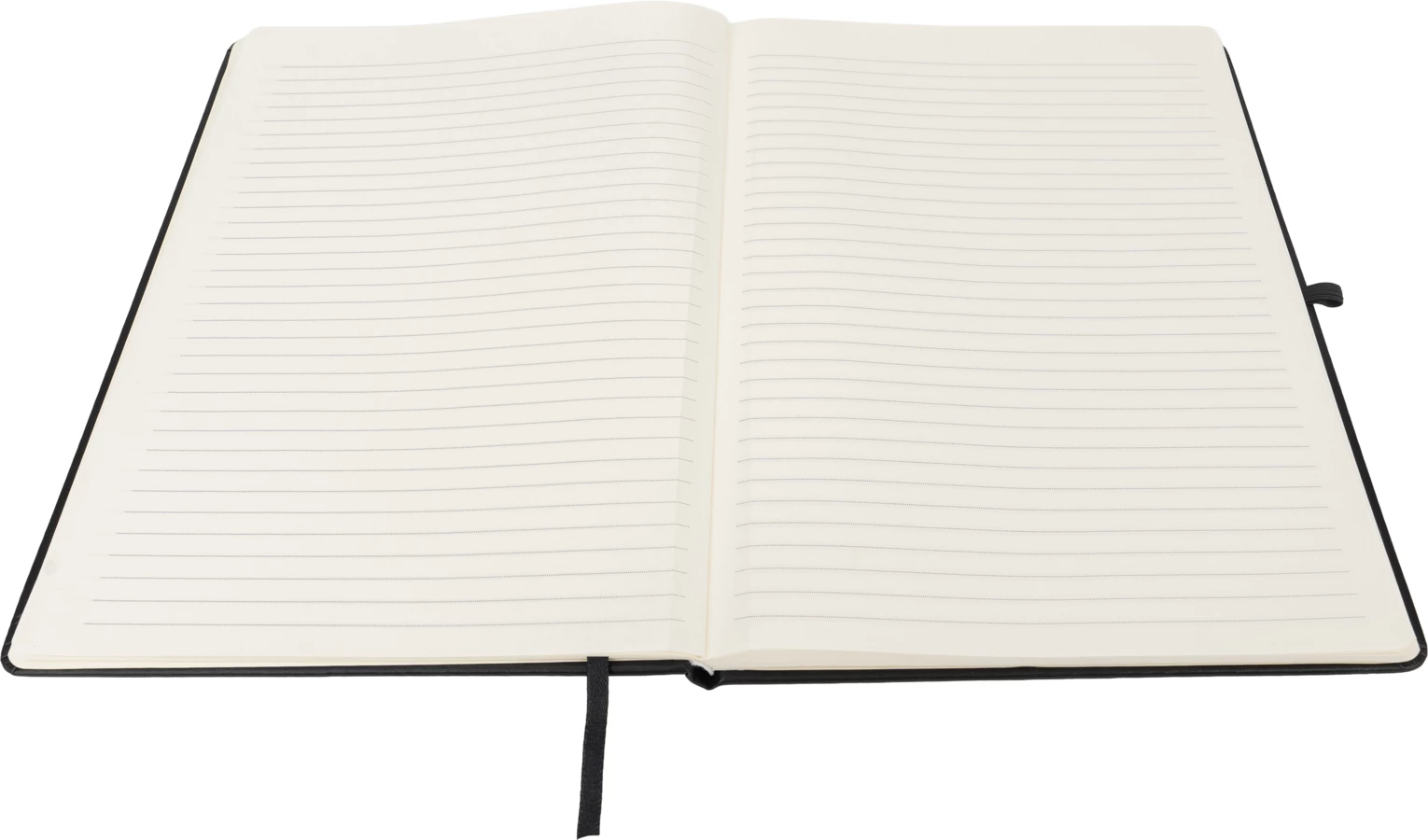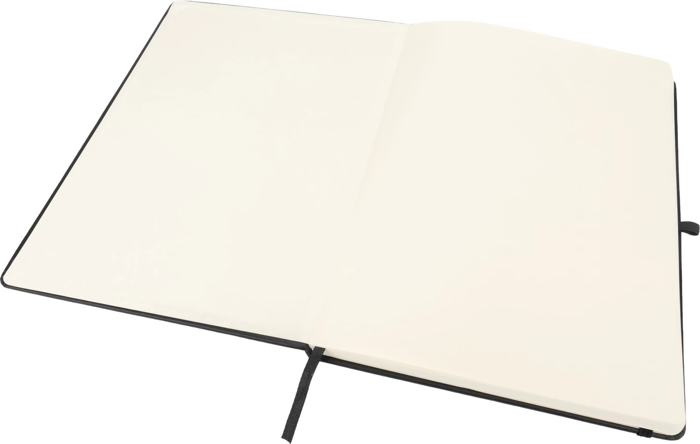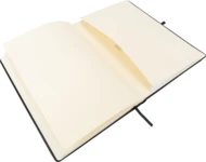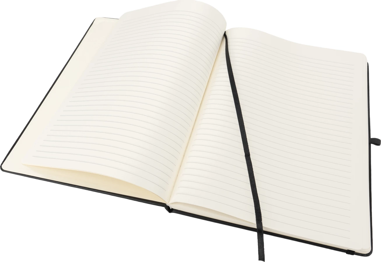 Notes A4 w linie (80 kartek) z okładką z tworzywa sztucznego, zakładką i miejscem na długopis. Zamykany na gumkę.