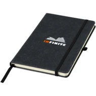 Notatnik biurowy w formacie A5 z okładką wykonaną z resztek skóry. Posiada elastyczną taśmę, pętlę na długopis, zakładkę tasiemkową i 80 arkuszy w linie.