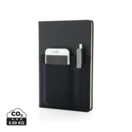Notatnik A5 (80 kremowych kartek 80 g/m2 w linie), kieszenie na okładce, w tym na telefon (do 8 cm szerokości), miejsce na przybory do pisania, duża kieszeń na dokumenty, ślad węglowy produktu: 0,69 kg CO2