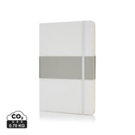 Notatnik A5 (80 kremowych kartek 80 g/m2 w linie), twarda okładka, tasiemka zakładkowa, elastyczna opaska do zamykania, obwoluta, zaokrąglone rogi, ślad węglowy produktu: 0,7 kg CO2