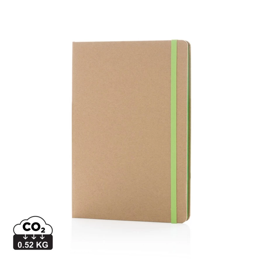 Notatnik A5 (72 kremowe kartki 70 g/m2 w linie), wykonany z papieru makulaturowego, tasiemka zakładkowa i elastyczna opaska do zamykania, ślad węglowy produktu: 0,52 kg CO2