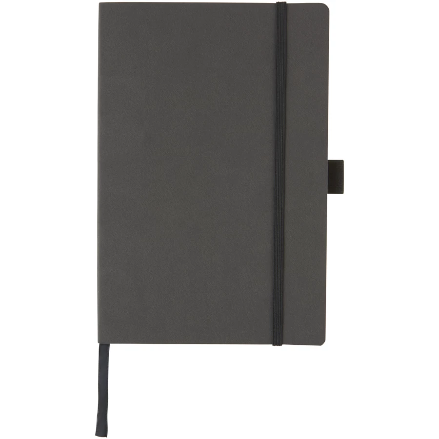Elastyczny i miękki w dotyku notatnik (rozmiar A5) z wbudowanym elastycznym zamknięciem, wstążką, pętelką na długopis, kieszenią na dokumenty po wewnętrznej stronie okładki i 80 arkuszami (80 g) kremowego papieru w linię. Czarne opakowanie.