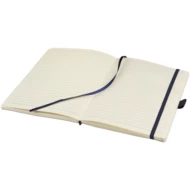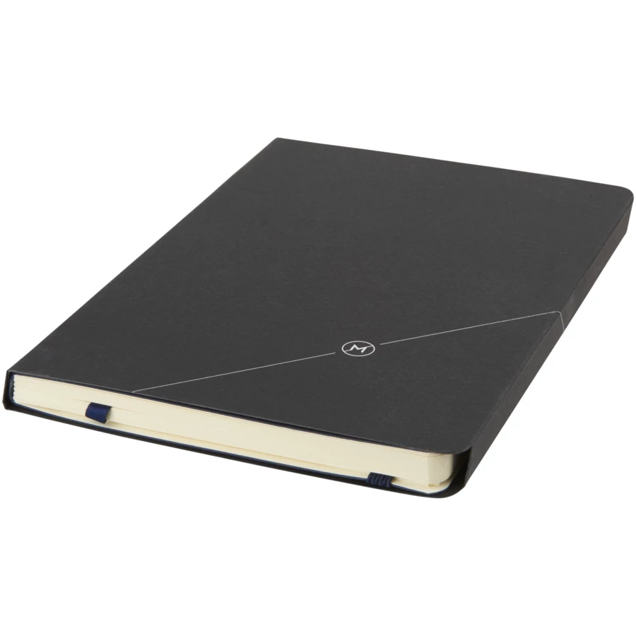 Elastyczny i miękki w dotyku notatnik (rozmiar A5) z wbudowanym elastycznym zamknięciem, wstążką, pętelką na długopis, kieszenią na dokumenty po wewnętrznej stronie okładki i 80 arkuszami (80 g) kremowego papieru w linię. Czarne opakowanie.