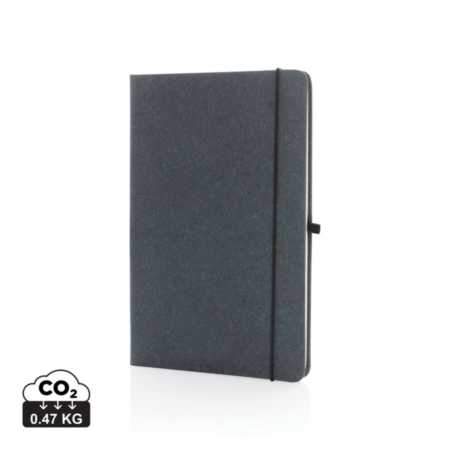 Notatnik A5 (80 białych kartek 70 g/m2 w linie), elastyczna opaska do zamykania, miejsce na przybory do pisania, okładka wykonana ze skóry pochodzącej z recyklingu, ślad węglowy produktu: 0,47 kg CO2