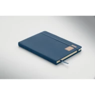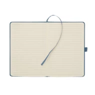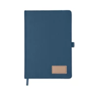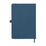 Notatnik A5 z twardą okładką ze sztruksu poliestrowego RPET i 192 stron w linie z papieru makulaturowego (70 gr/m2). Zamykany na gumkę, z pętelką na długopis, wstążką i przywieszką z papieru kraft.