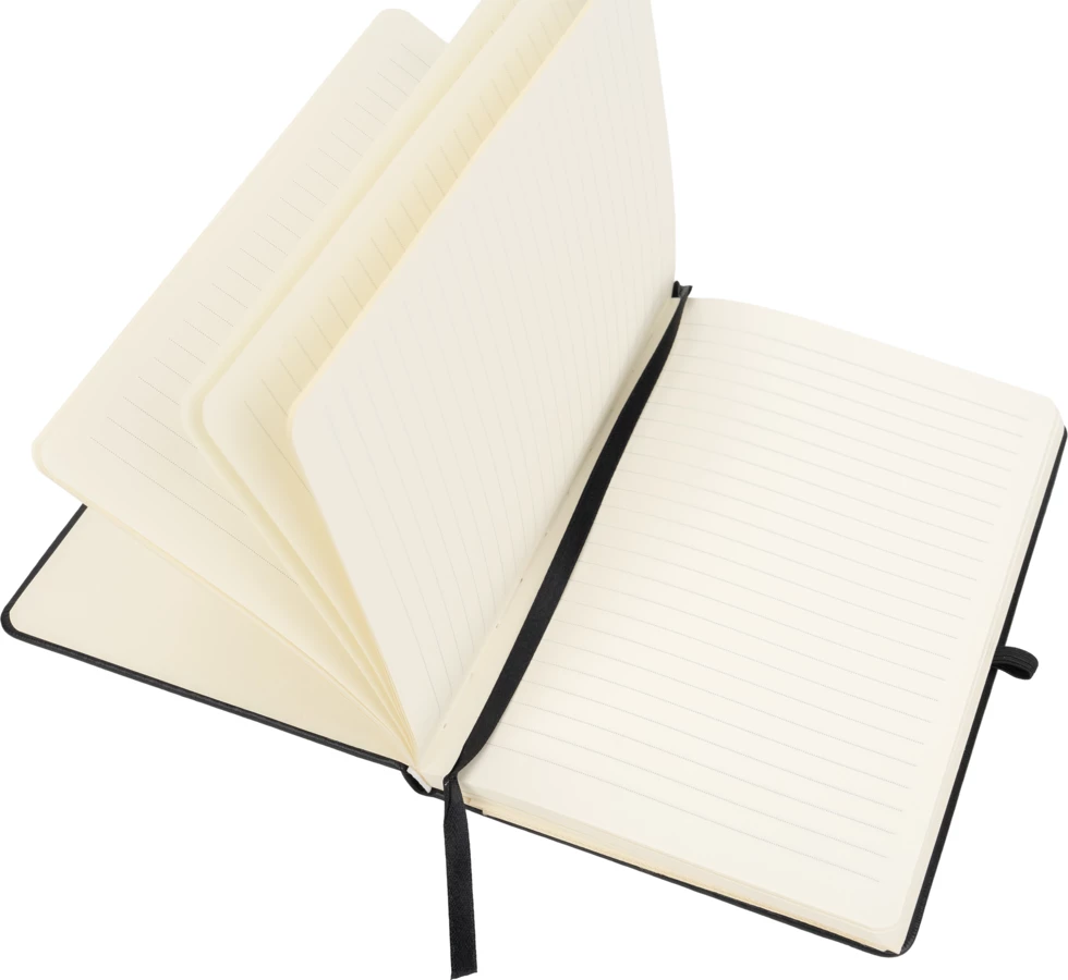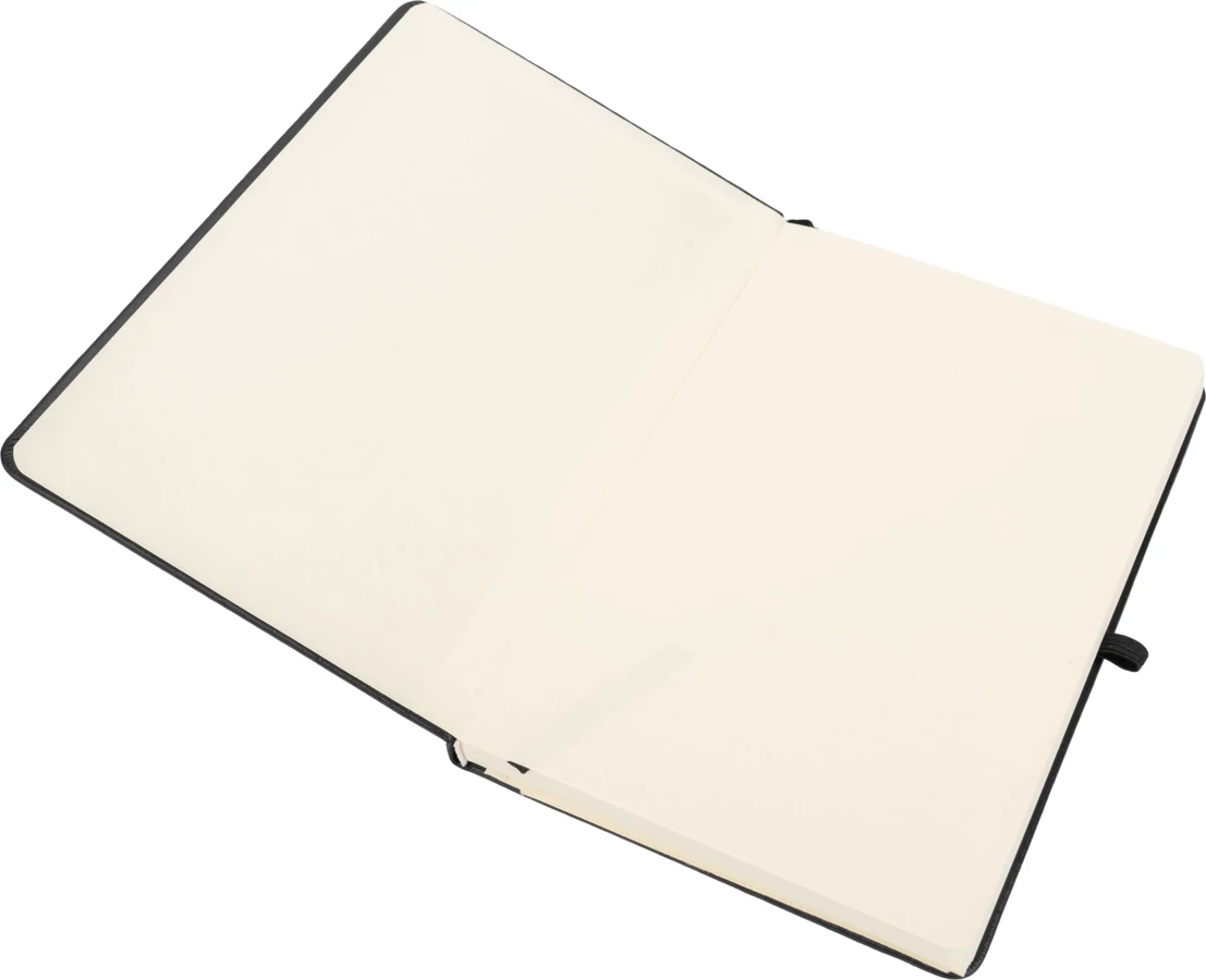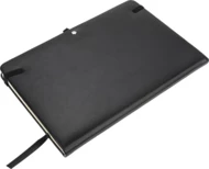 Notatnik A5 z okładką z imitacji skóry, 80 kartkami w linie, zakładką, miejscem na długopis i kieszonką na wewnętrznej stronie okładki. Zamykany elastyczną taśmą.