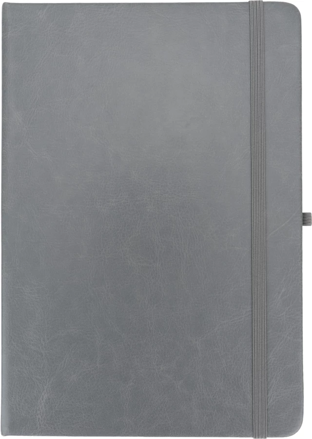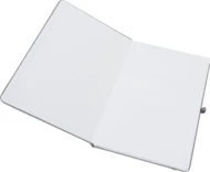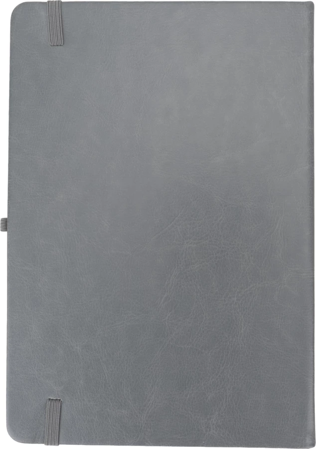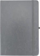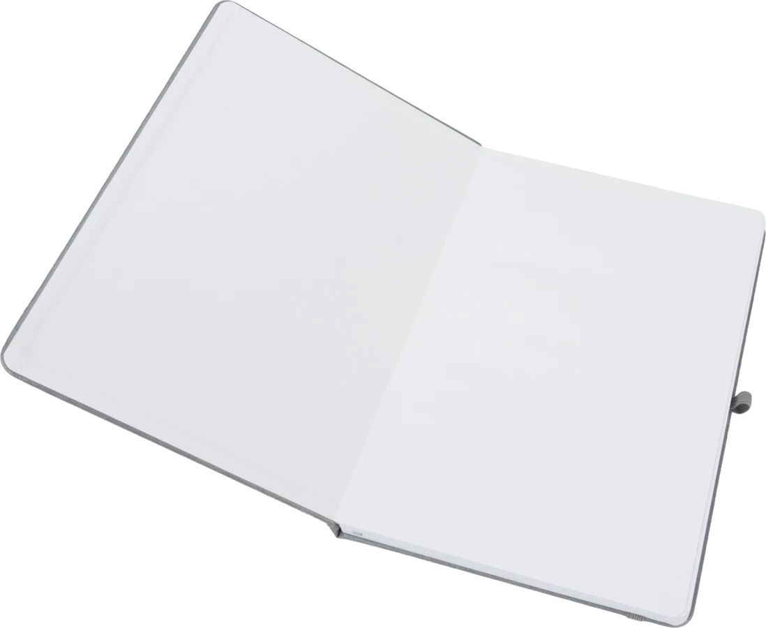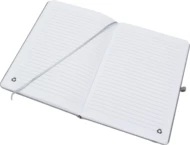 Notes o formacie A5, z okładką wykonaną z PU pochodzącego z recyklingu, posiada 192 strony w linie, zamknięcie na gumkę, materiałową zakładkę i pętelkę na długopis.