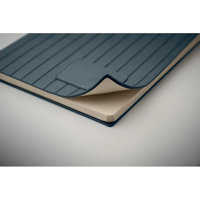 Notatnik A5 z miękką, prążkowaną okładką z PU wykonaną w 40% z materiałów pochodzących z recyklingu i w 60% z PU, z gładką naszywką z PU. 160 stron w linie, papier z recyklingu o gramaturze 70 g/m² (80 arkuszy). Dopasowany kolorystycznie znacznik strony z tasiemki.