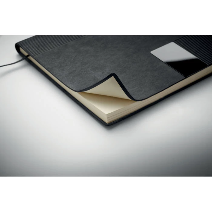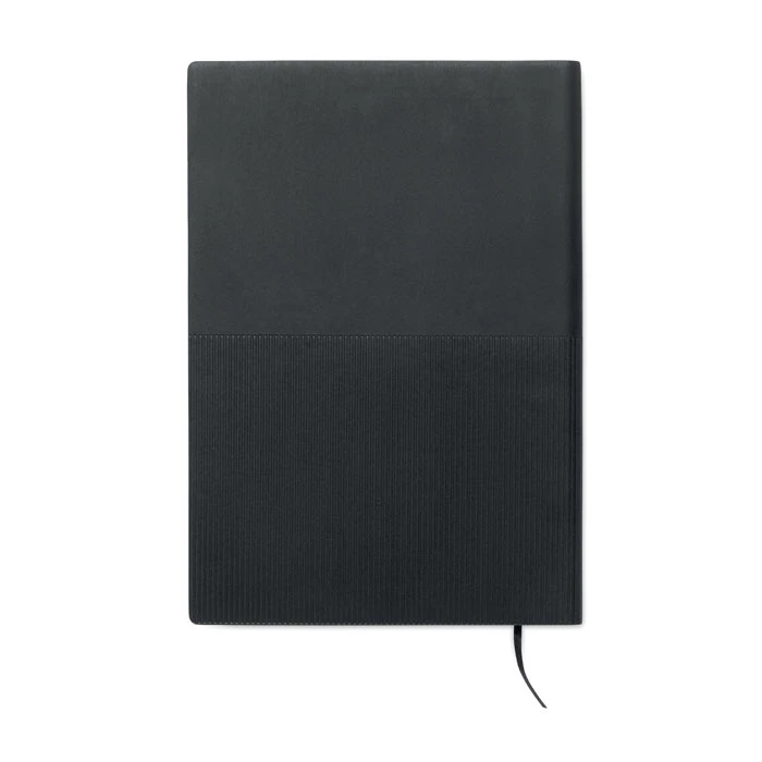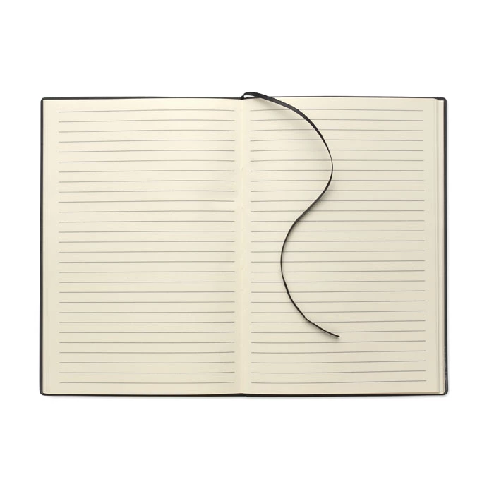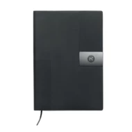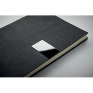 Notatnik A5 z miękką okładką z PU. 160 stron w linie z papieru z recyklingu (80 arkuszy). Dopasowana gumka i zakładka ze wstążki. Metalowy detal z przodu.