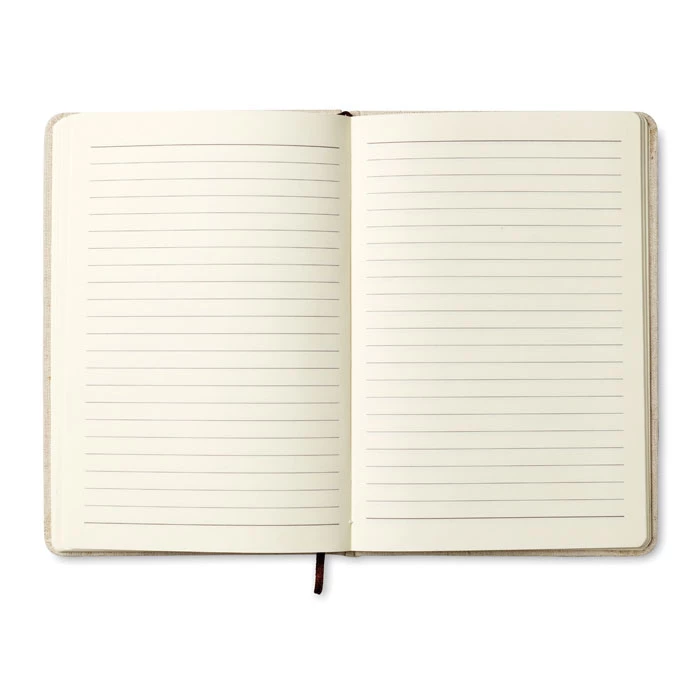 Notatnik A5 z twardą płócienną okładką. Oprawiony. 192 strony w linie z papieru z recyklingu (96 arkuszy). Kontrastowy elastyczny pasek i wstążka do oznaczania stron.