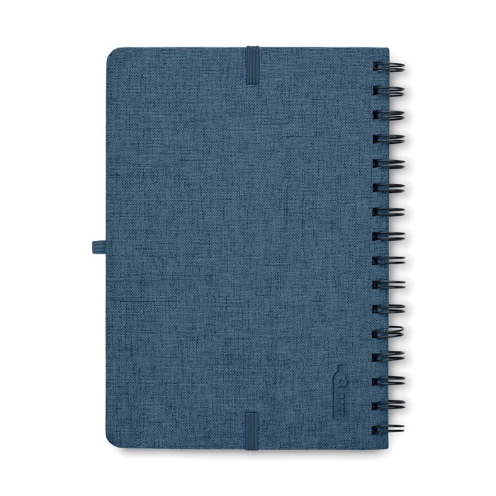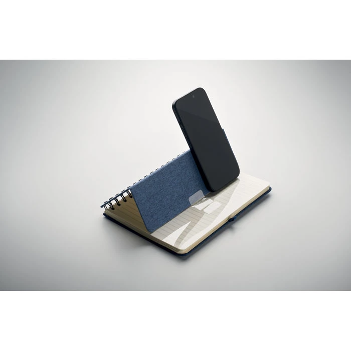 Notatnik A5 z twardą okładką 600D RPET z funkcją podstawki na smartfon. Podwójny splot. 160 stron w linie (80 arkuszy). papier z recyklingu o gramaturze 70 g/m². Elastyczny pasek zamykający.