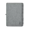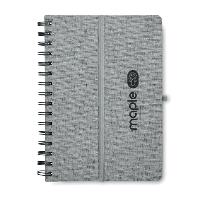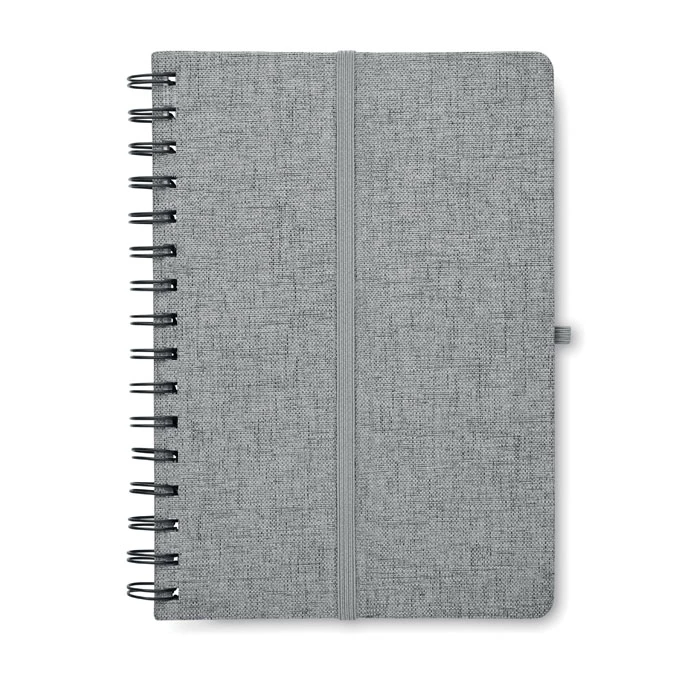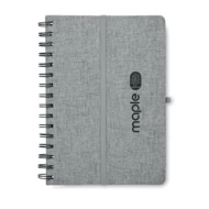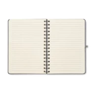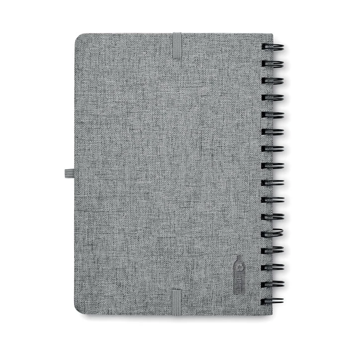 Notatnik A5 z twardą okładką 600D RPET z funkcją podstawki na smartfon. Podwójny splot. 160 stron w linie (80 arkuszy). papier z recyklingu o gramaturze 70 g/m². Elastyczny pasek zamykający.