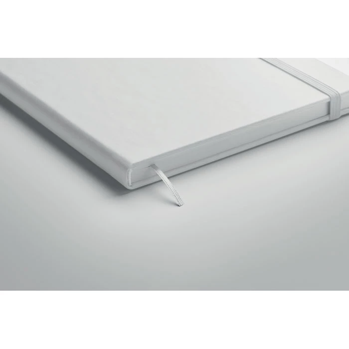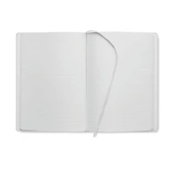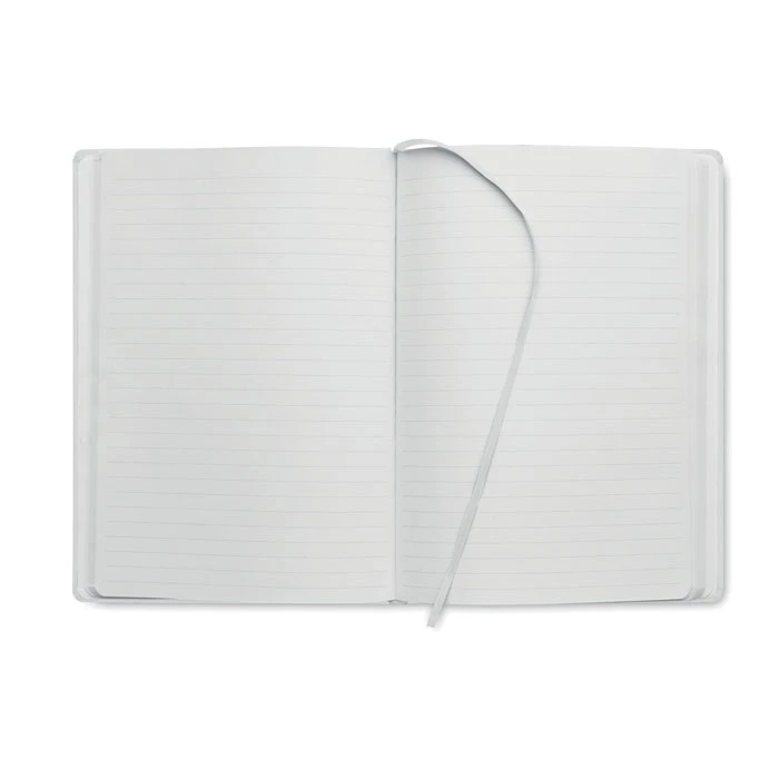 Notatnik A5 z twardą okładką z PU. 200 strony w linie (100 kartek) z papieru z recyklingu (80 g/m²). Dopasowana gumka zamykająca i tasiemka do zaznaczania stron. Wyprodukowano w UE.