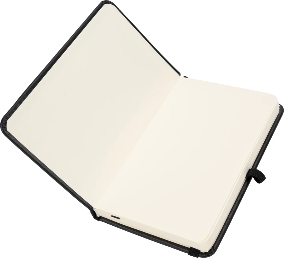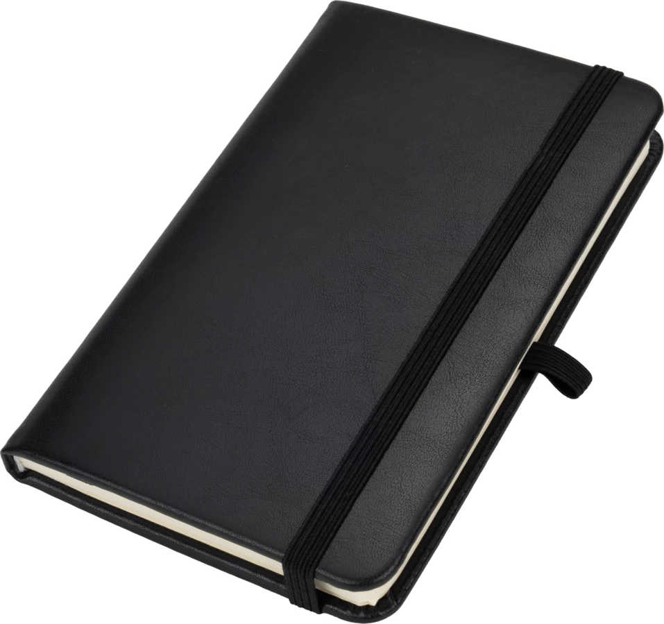 Notatnik A6 w okładce ze skóry syntetycznej, ze 160 stronami w linie, zakładką, pętelką na długopis i gumką do zamykania.