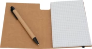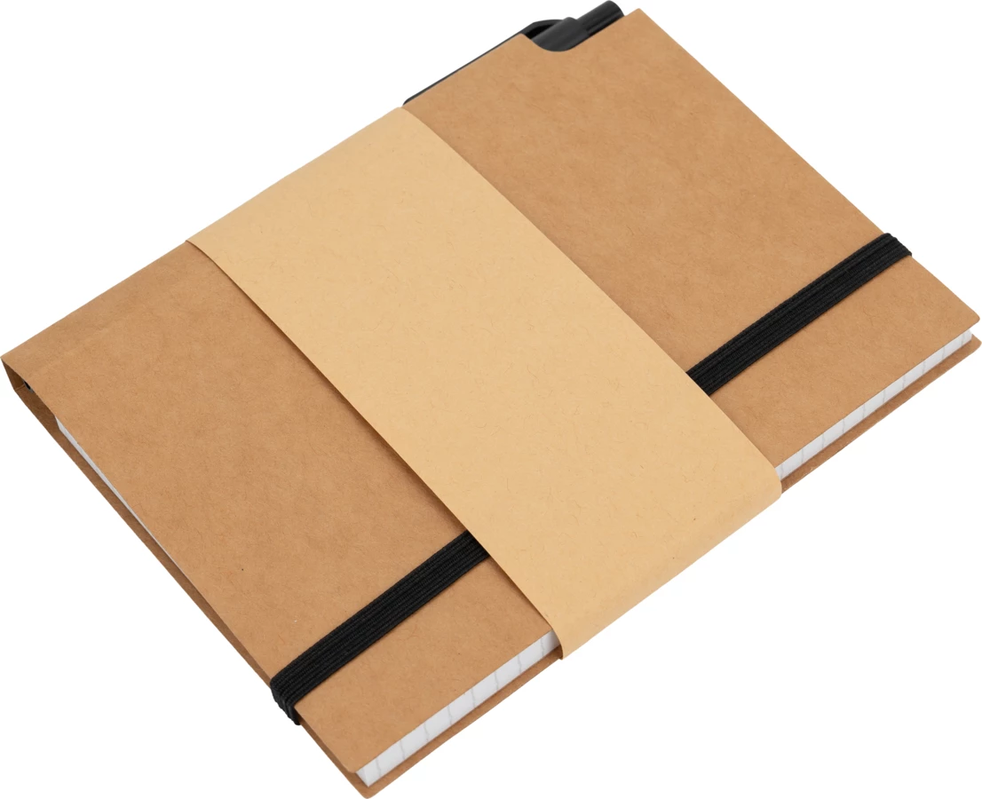 Mały notes (160 stron w kratkę) z ekologiczną okładką z kartonu i gumką do zamykania. W zestawie z długopisem.