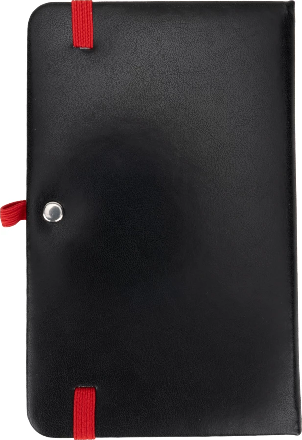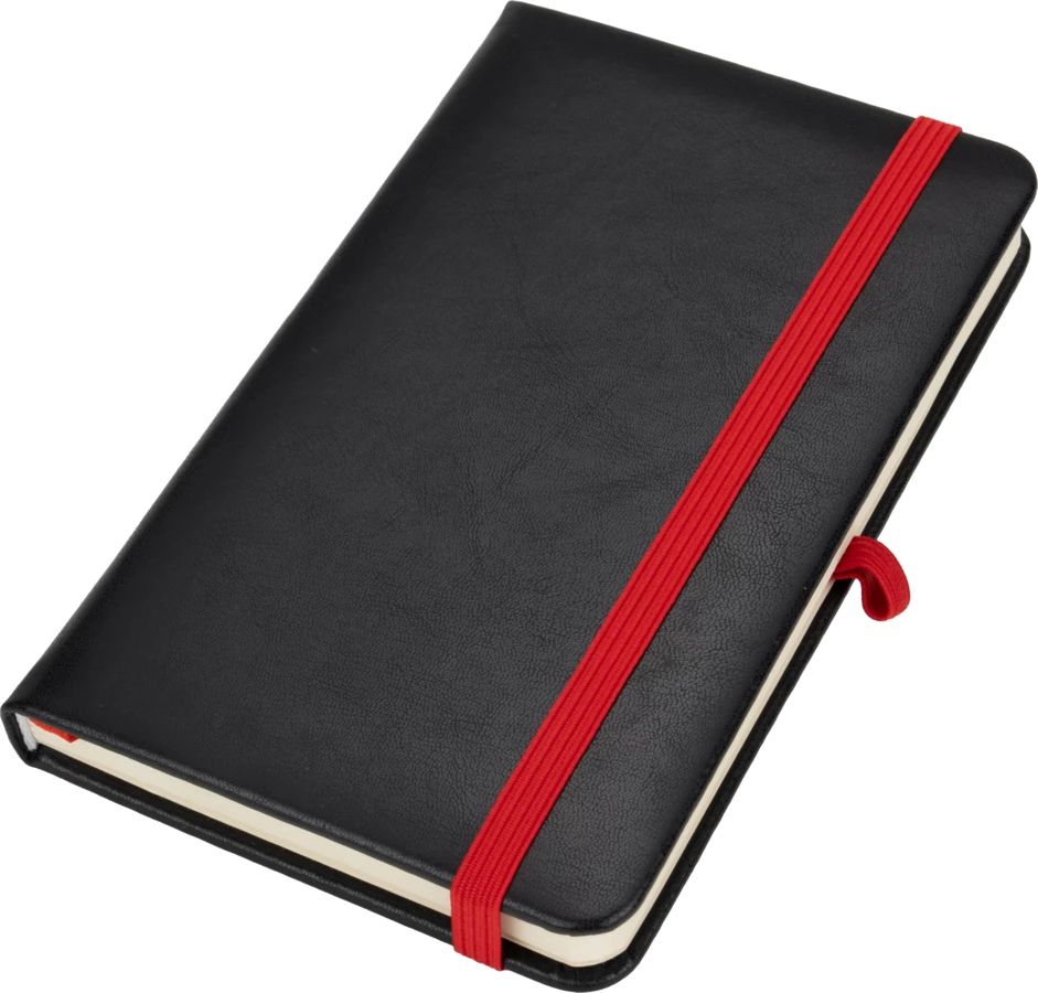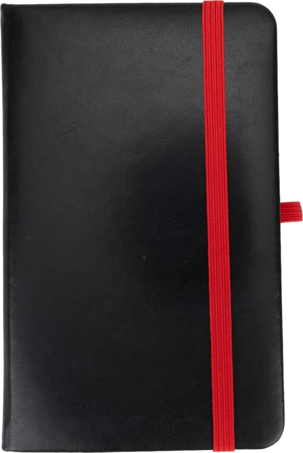 Notatnik A6 w okładce ze skóry syntetycznej, ze 160 stronami w linie, zakładką, pętelką na długopis i gumką do zamykania.
