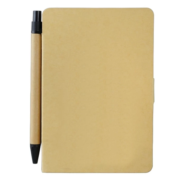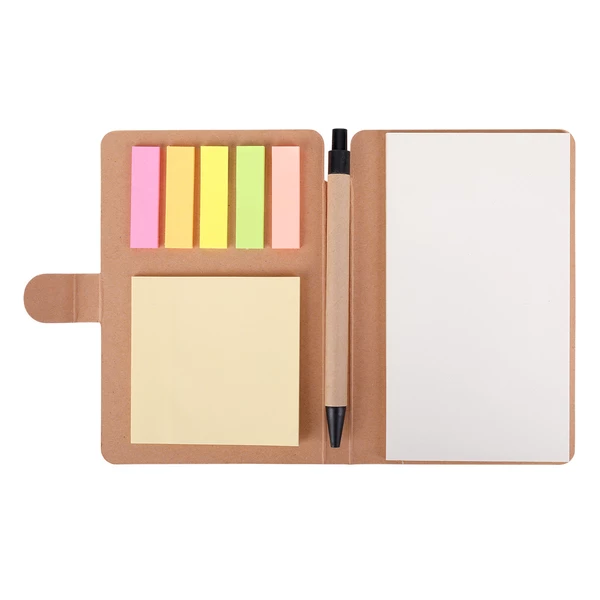 Wykonany z papieru z surowców wtórnych 78 g/m2 50 kartkowy gładki notes A6 (80x145 mm) z długopisem (135x10x14 mm) z kartonu z plastikową skuwką, 25 szt żółtych karteczek samoprzylepnych 80 g/m2 (75x75 mm), 5x25 szt. karteczek samoprzylepnych (80 g/m2) o wymiarze 12x45 mm. Rozmiar kieszonkowy.