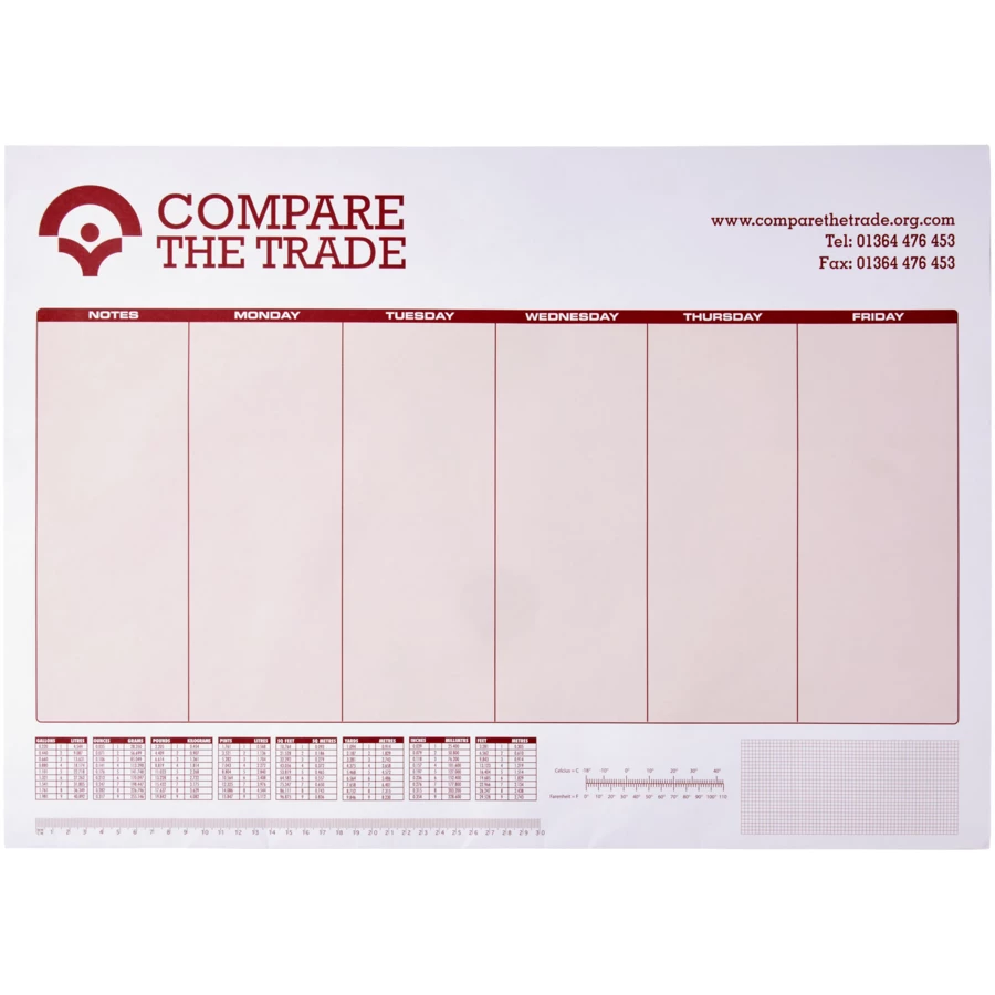 Biały notatnik Desk-Mate® w formacie A3 Składa się z czystych kartek o gramaturze 80g/m2. Standardowo 50 kartek, dostępny również w wersjach 25 lub 100 kartek. Możliwość zdobienia każdego arkusza. Wymiar arkusza: 420x297 mm.