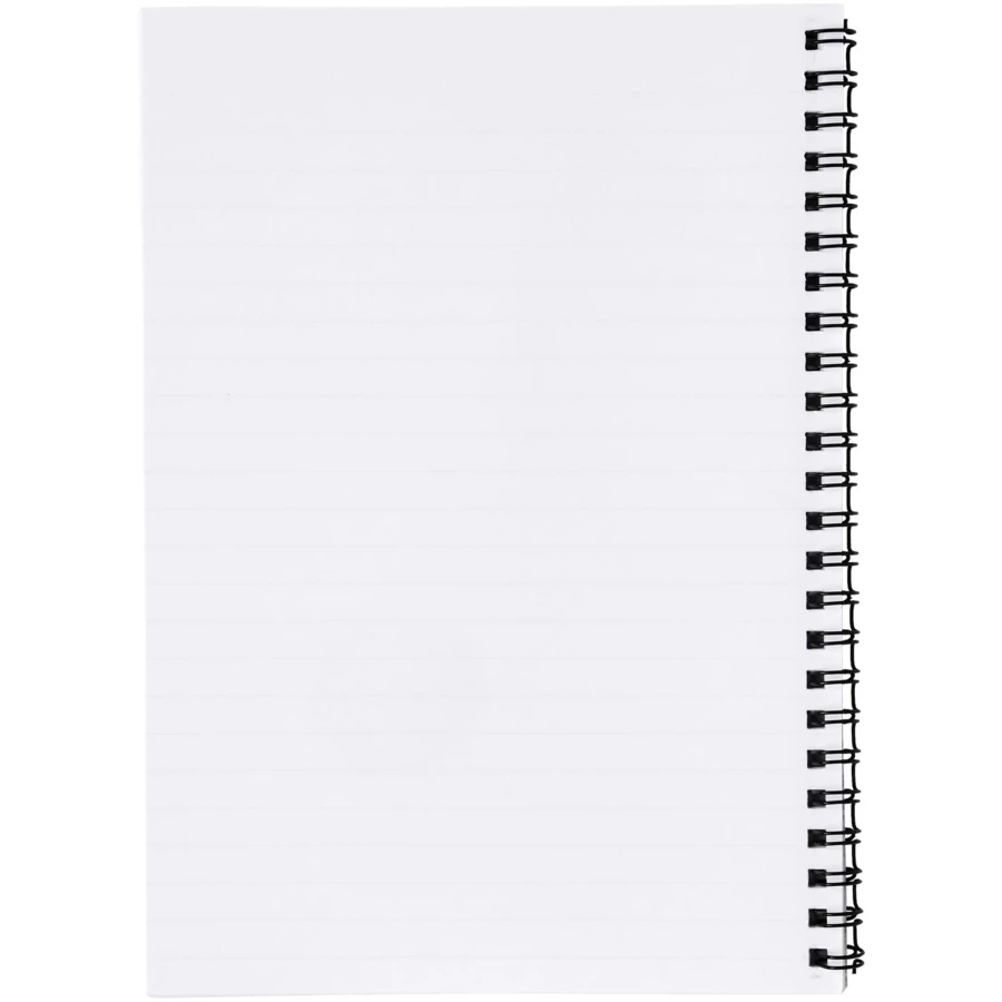 Notatnik na spirali Desk-Mate® w formacie A4. Zawiera 50 arkuszy (80 g/m2) czystych kartek z okładką (450 g/m2). Okładka odporna na rozrywanie i działanie wody. Biała przedziałka. Możliwość zdobienia okładki i każdego arkusza.