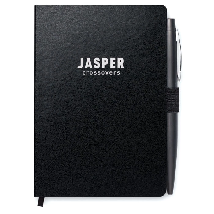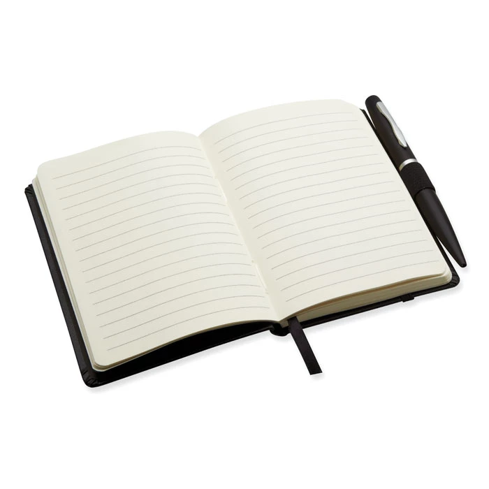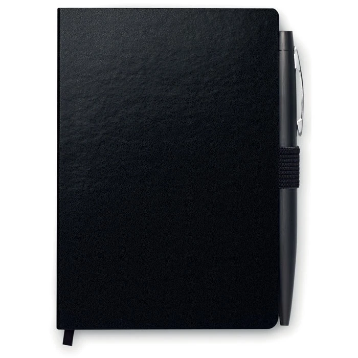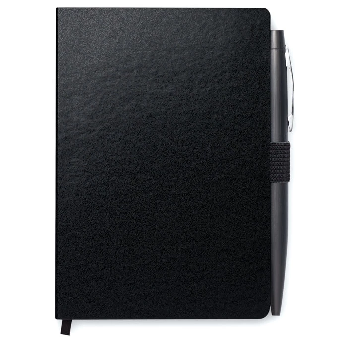 Notes A6 z długopisem. Twarda okładka z PU. 144 strony w linie (72 kartki). Dopasowany elastyczny pasek zamykający i uchwyt na długopis. Dopasowany metalowy długopis z przyciskiem. Niebieski tusz. FSC MIX CREDIT | P7.1 | FSC-C213206