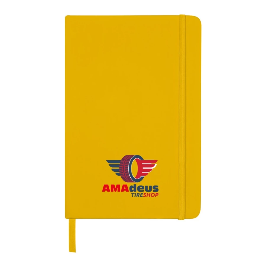 Notatnik w formacie ok. A5, posiada 96 kartek w linie (192 strony), tasiemka zakładkowa umożliwia wygodne zaznaczanie ostatniej strony lub ważniejszych notatek, dodatkowe zamknięcie w postaci dopasowanej kolorystycznie elastycznej opaski, twarda okładka wykonana z PU