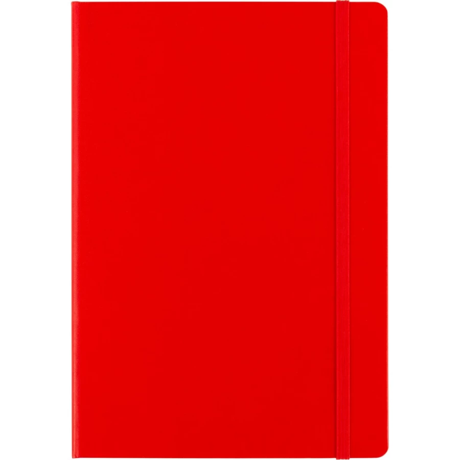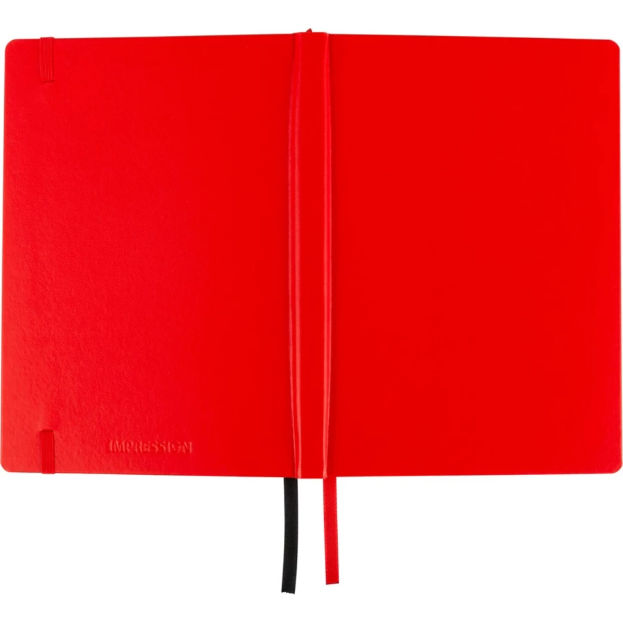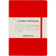 Notatnik (ok. A5, 128 kartek w linie), papierowa kieszeń na wewnętrznej stronie tylnej okładki, elastyczna opaska do zamykania i tasiemka zakładkowa, tylna okładka z logo IMPRESSION