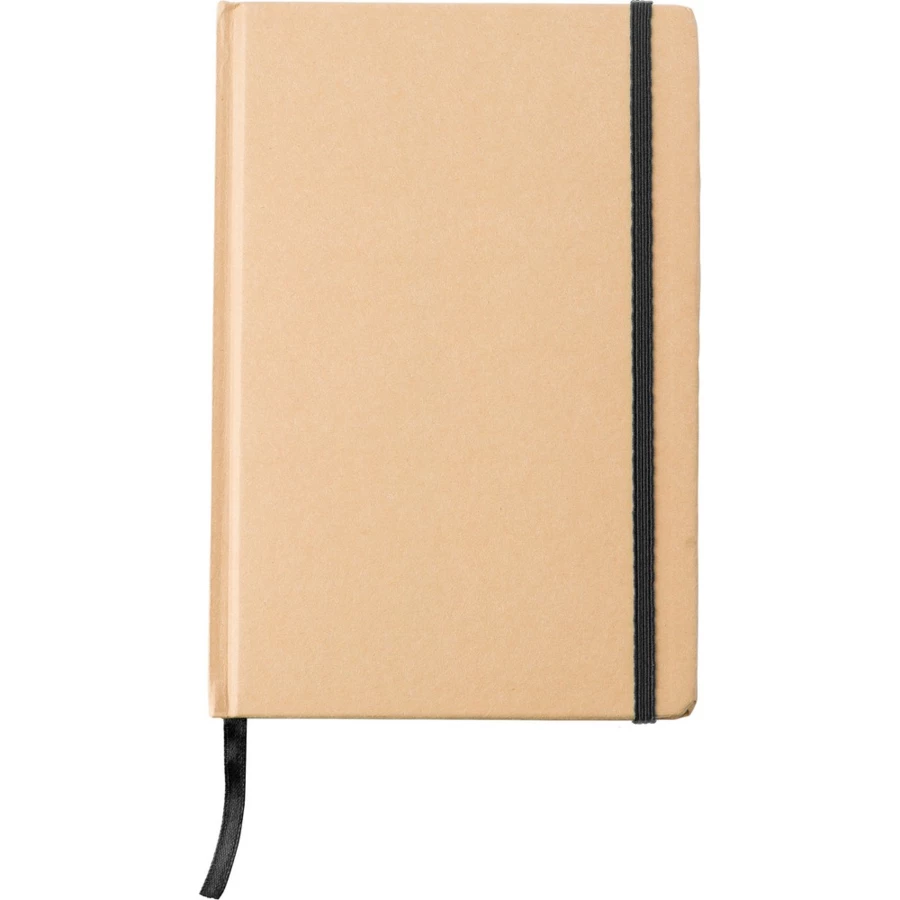 Notatnik (ok. A5, 80 kartek w linie), wykonany z kartonu z recyklingu, tasiemka zakładkowa, elastyczna opaska do zamykania