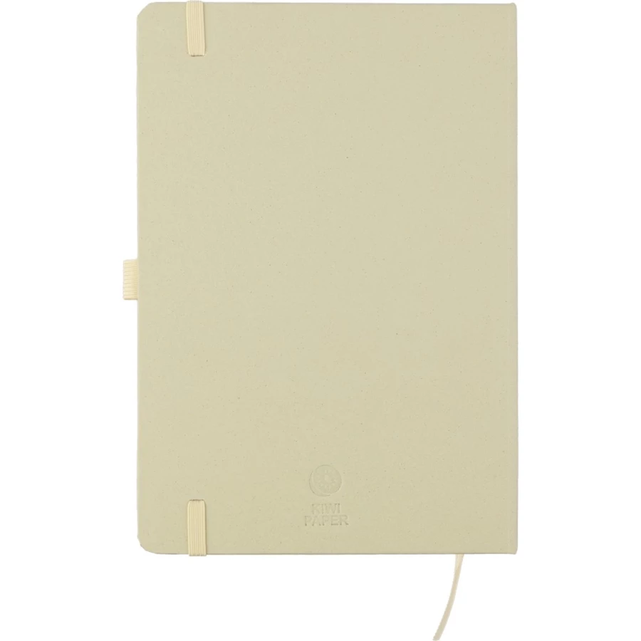 Notatnik w formacie ok. A5, posiada 80 stron w linie drukowanych tuszem sojowym, tasiemka zakładkowa umożliwia wygodne zaznaczanie ostatniej strony lub ważniejszych notatek, dodatkowe zamknięcie w postaci dopasowanej kolorystycznie elastycznej opaski, zmieści się do szkolnego plecaka, notatnik posiada papierową okładkę Favini pochodzącą z Włoch, ikona surowca na produkcie, produkt wykonany z kartonu i resztek produkcyjnych (04 - lawenda, 05 - wiśnia, 06 - cytrusy, 18 - migdały, 25- winogrona) oraz papieru 70 g/m²