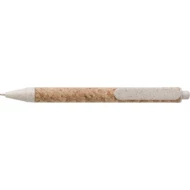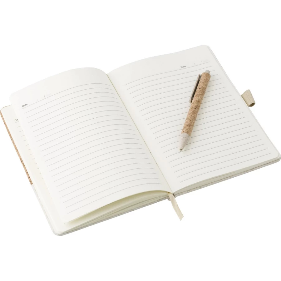 Notatnik (ok. A5, 80 kartek w linie), okładka wykonana z korka i płótna, tasiemka zakładkowa, długopis ze słomy pszenicznej w komplecie, w pudełku