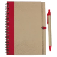 Notatnik w formacie ok. A5, posiada 60 kartek w linie (120 stron) i spiralne bindowanie, w komplecie znajduje się długopis z kolorowymi elementami, wkład w niebieskim kolorze, okładka wykonana z kartonu z kolorowym elementem przy bindowaniu