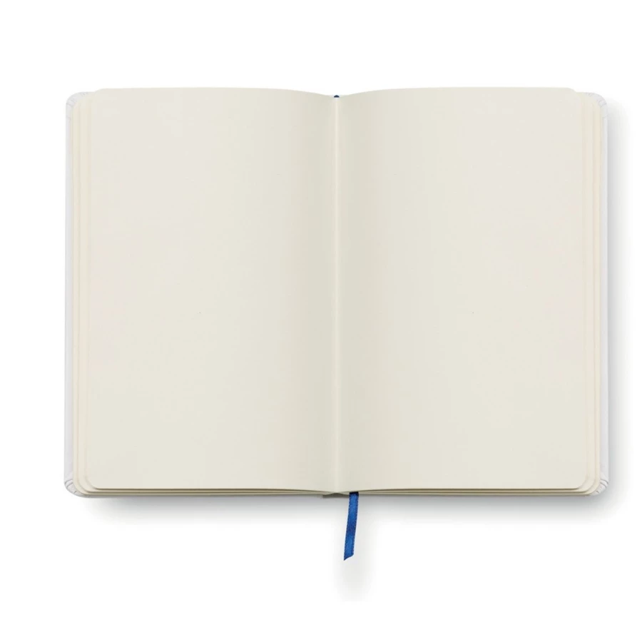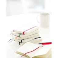 Notatnik (ok. A6, 80 pustych kartek), tasiemka zakładkowa, specjalna okładka pod znakowanie full colour, elastyczna opaska do zamykania