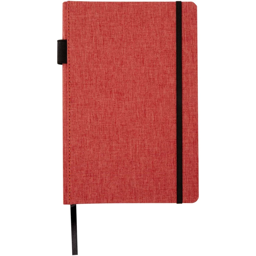 Notatnik w formacie A5 z okładką wykonaną z materiału RPET. Posiada 96 arkuszy w linie o gramaturze 70 g/m² z papieru z recyclingu, pętelkę na pióro i wstążkę. Pakowany w kartonowe opakowanie.