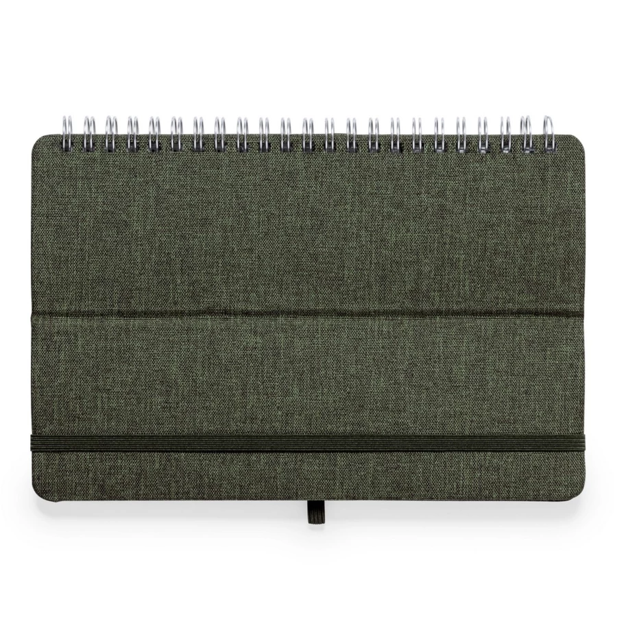 Notatnik RPET (ok. A5, 70 kartek w linie), stojak na telefon, stojak na tablet, twarda okładka, spiralne bindowanie, elastyczna opaska do zamykania, uchwyt na długopis
