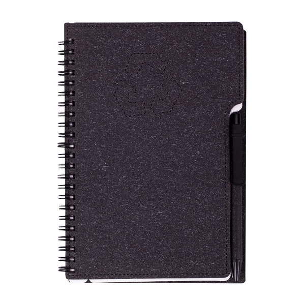 Eko notes w twardej oprawie z dołączonym długopisem w rozmiarze biurkowym (zbliżony do A5 lub większy). 70 kartek w linie (z perforacją), gramatura 70 g/m². Zarówno oprawa jak i papier wykonane zostały z surowców wtórnych. Nadają się one także do kolejnego przetworzenia. Korpus długopisu wykonany z tektury, klip, końcówka i przycisk wykonane z plastiku nadającego się do recyclingu, wkład w kolorze niebieskim. Notes posiada uchwyt na długopis.