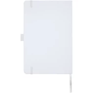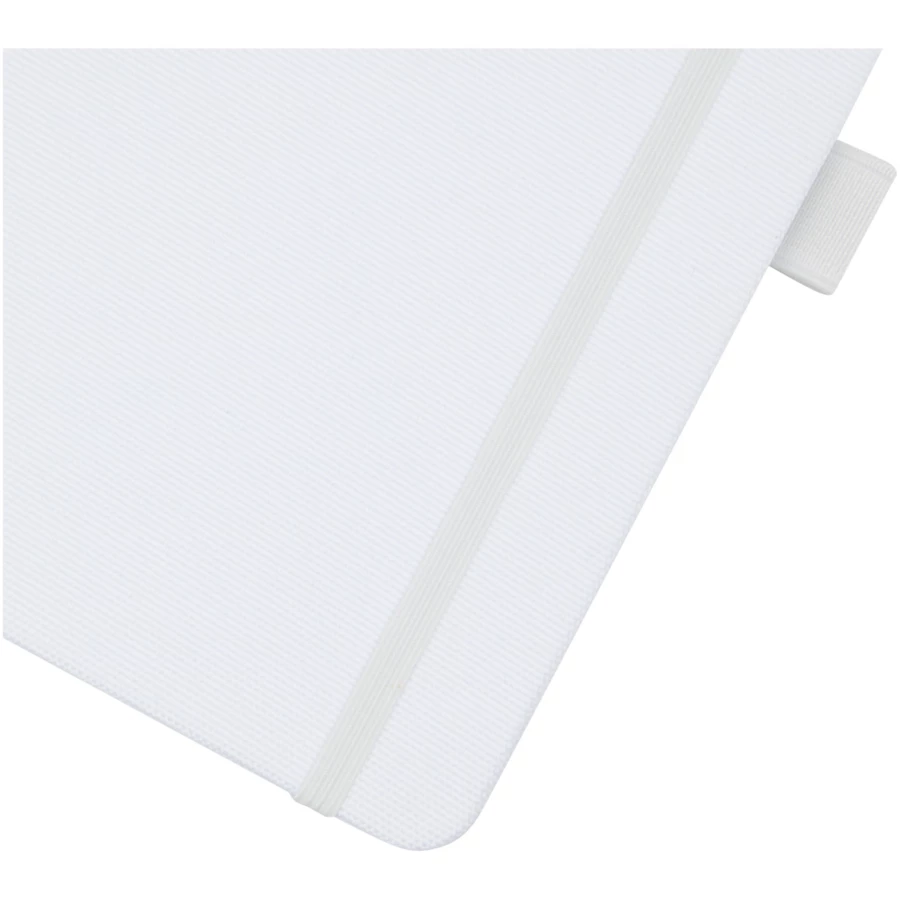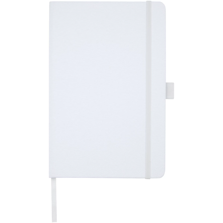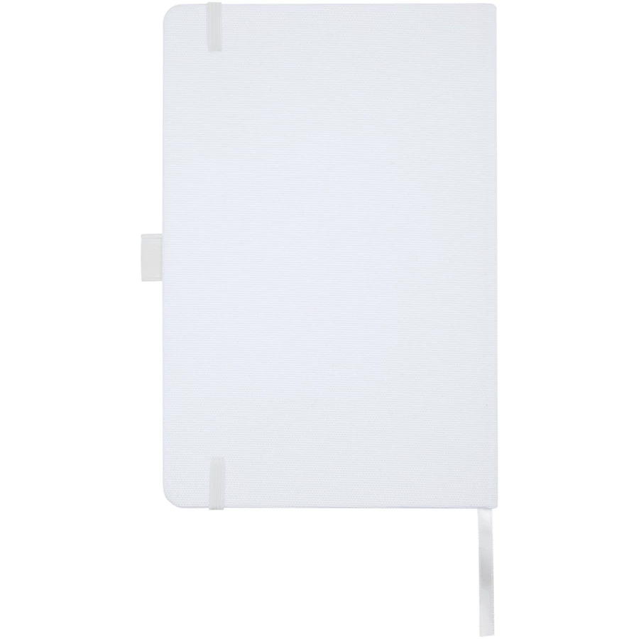 Notatnik w formacie A5 z okładką wykonaną z plastiku z recyklingu. Posiada 80 arkuszy w linie o gramaturze 70 g/m² z papieru z recyclingu, pętelkę na pióro i wstążkę.