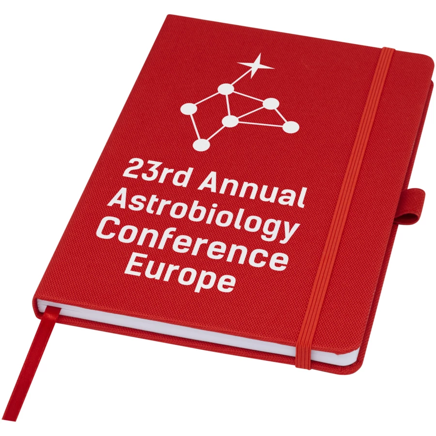 Notatnik w formacie A5 z okładką wykonaną z plastiku z recyklingu. Posiada 80 arkuszy w linie o gramaturze 70 g/m² z papieru z recyclingu, pętelkę na pióro i wstążkę.