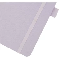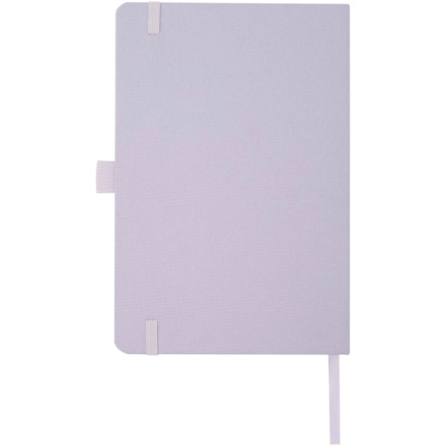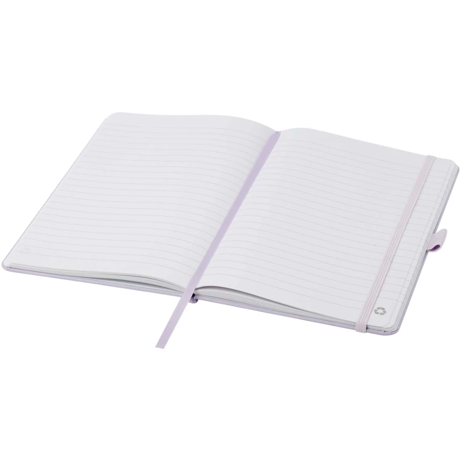 Notatnik w formacie A5 z okładką wykonaną z plastiku z recyklingu. Posiada 80 arkuszy w linie o gramaturze 70 g/m² z papieru z recyclingu, pętelkę na pióro i wstążkę.