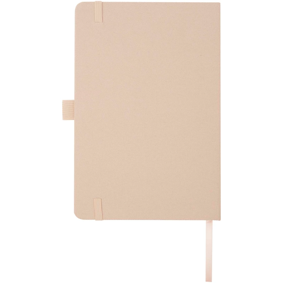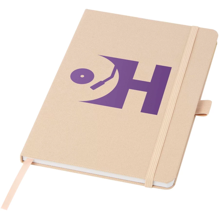 Notatnik w formacie A5 z okładką wykonaną z plastiku z recyklingu. Posiada 80 arkuszy w linie o gramaturze 70 g/m² z papieru z recyclingu, pętelkę na pióro i wstążkę.