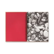 Notatnik z okładką z kartonu z recyklingu. Podwójna spirala. 140 stron w linie z papieru mineralnego (70 arkuszy). Papier mineralny jest wykonany z węglanu wapnia i HDPE (żywicy polietylenowej) stosowanej jako spoiwo. Jest wodoodporny i odporny na tłuszcz.
